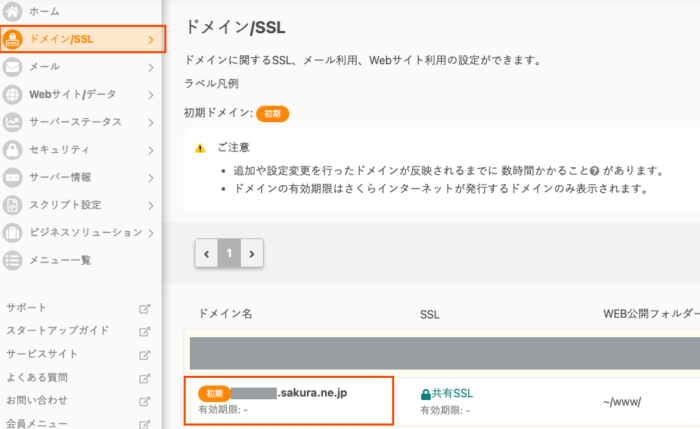 3.ドメイン/SSLのところの「初期」というところのドメインの後ろに作ったディレクトリ名[test]にアクセスする。